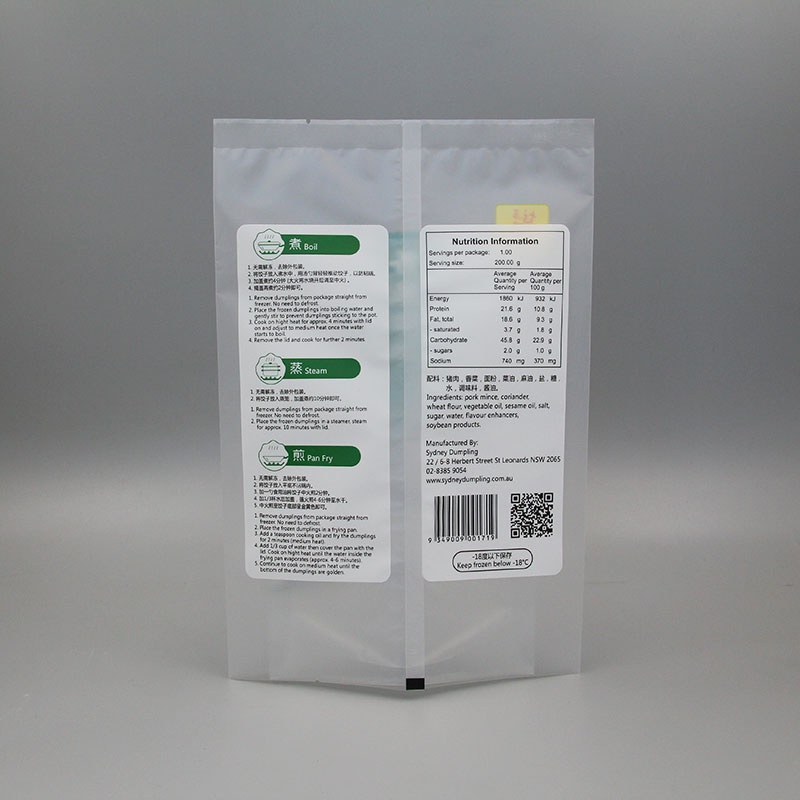 本产品为哑光塑料复合冷冻背封袋,简单印刷,大面积透明包装,体现出简洁的特点,同时降低印刷成本,为公司带来更高的利润空间。背封袋结合了四边封袋多列同时包装速度快和三边封袋空间率用率高的优点,相对四边封袋,在不影响生产速度的同时能够减少约40%包材用量,具有非常明显的包装成本优势。香蕉爱视频包装选择耐低温材料,强韧性好,阻隔优,耐寒、耐油,抗封口污染性好,密闭性高。