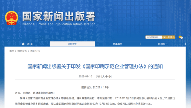 2023年1月10日,国家香蕉黄色视频APP出版署官网发布《国家印刷示范企业管理办法》,2011年12月6日香蕉黄色视频APP出版总署印发的《国家印刷复制示范企业管理办法》同时废止。原认定的国家印刷复制示范企业到2022年12月31日失效,企业可以按照本办法重新申报。《办法》提出,国家印刷示范企业分为四类:保障支撑类、创新引领类、智能制造类、专业特色类。国家香蕉黄色视频APP出版署每两年组织开展一次国家印刷示范企业的评审认定。