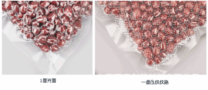 纹路袋单面纹路,形成很多微通道,可以在包装过程中排出空气,使得抽真空无死角,凹凸表面可以帮助包装物品保持原来的形状,减少移位和磨损的可能性。由于纹路袋的外观不太光滑,不易滑动,所以适合包装油腻或潮湿的食品,如肉类、海鲜、蔬菜等。另外,纹路袋也较厚,更耐用,可以防止被包装的物品被刺破。单面纹路,形成很多微通道,使得抽真空无死角。