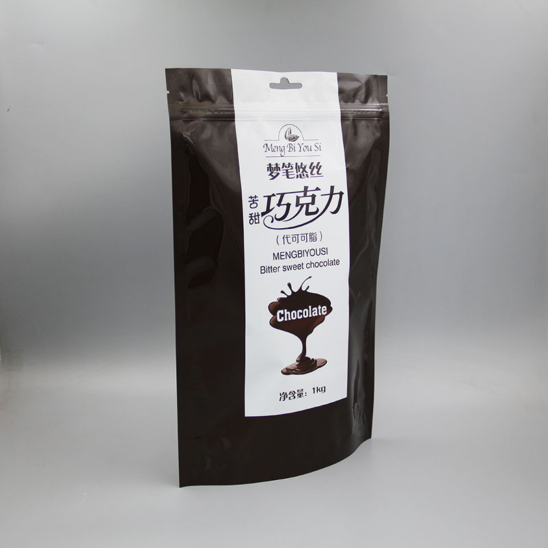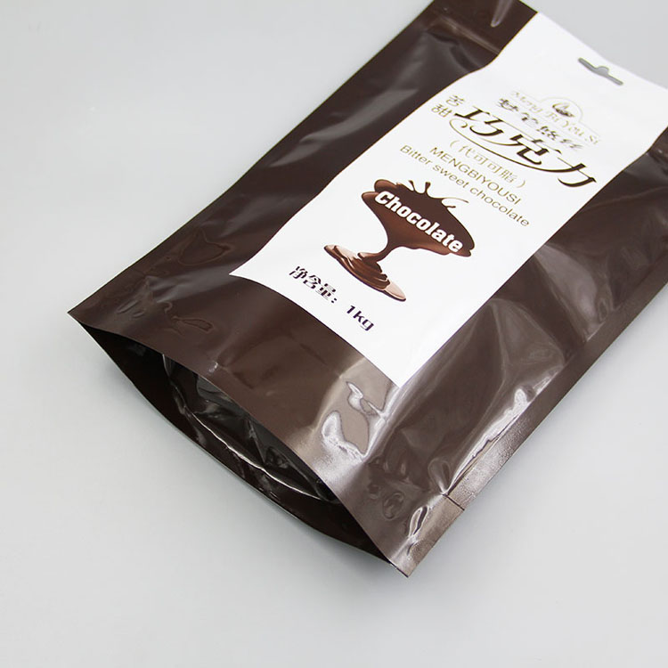 本产品为亮面镀铝自立 拉链袋 。铝箔是巧克力包装的标配,因为巧克力本身容易融化,而铝箔具有防潮作用,还有一定的遮光性,能很好的保证巧克力的稳定性,避免融化。拉链上部