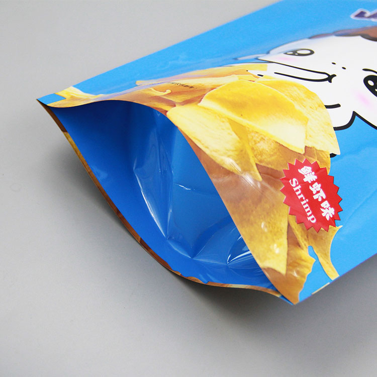 本产品为亮面镀铝 自立袋 ,包装增加镀铝层,能很好的起到防水防潮的效果,为薄片类食品提供一个干燥空间,保证食品到消费者口中依然酥脆。亮面包装印刷银色更鲜艳,更具光泽